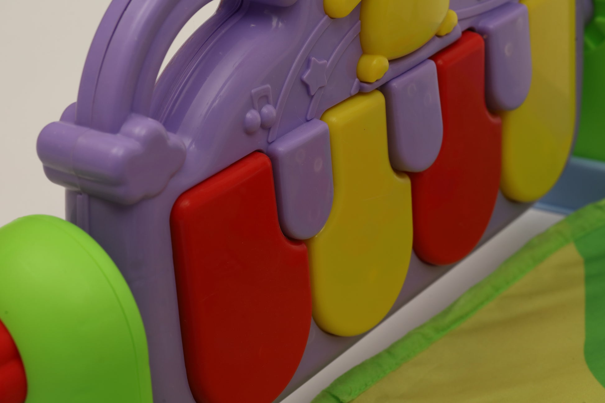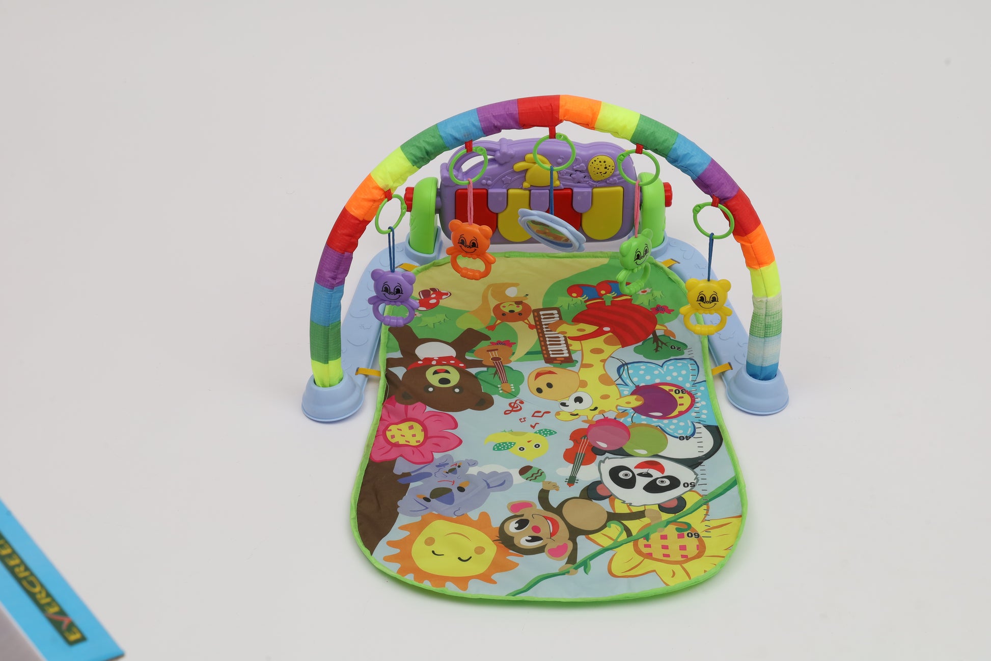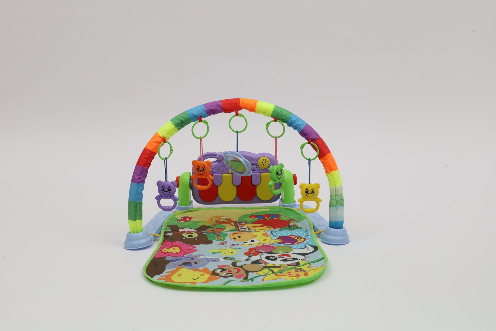 Safe, fun, colorful and interactive play mat that is perfect for baby's tummy time. This baby play gym features a soft, plush, padded and machine washable mat. There are four rattle toys and a mirror that baby can peek into. There is also a music keyboard that will play music as baby kicks. (charger not included)