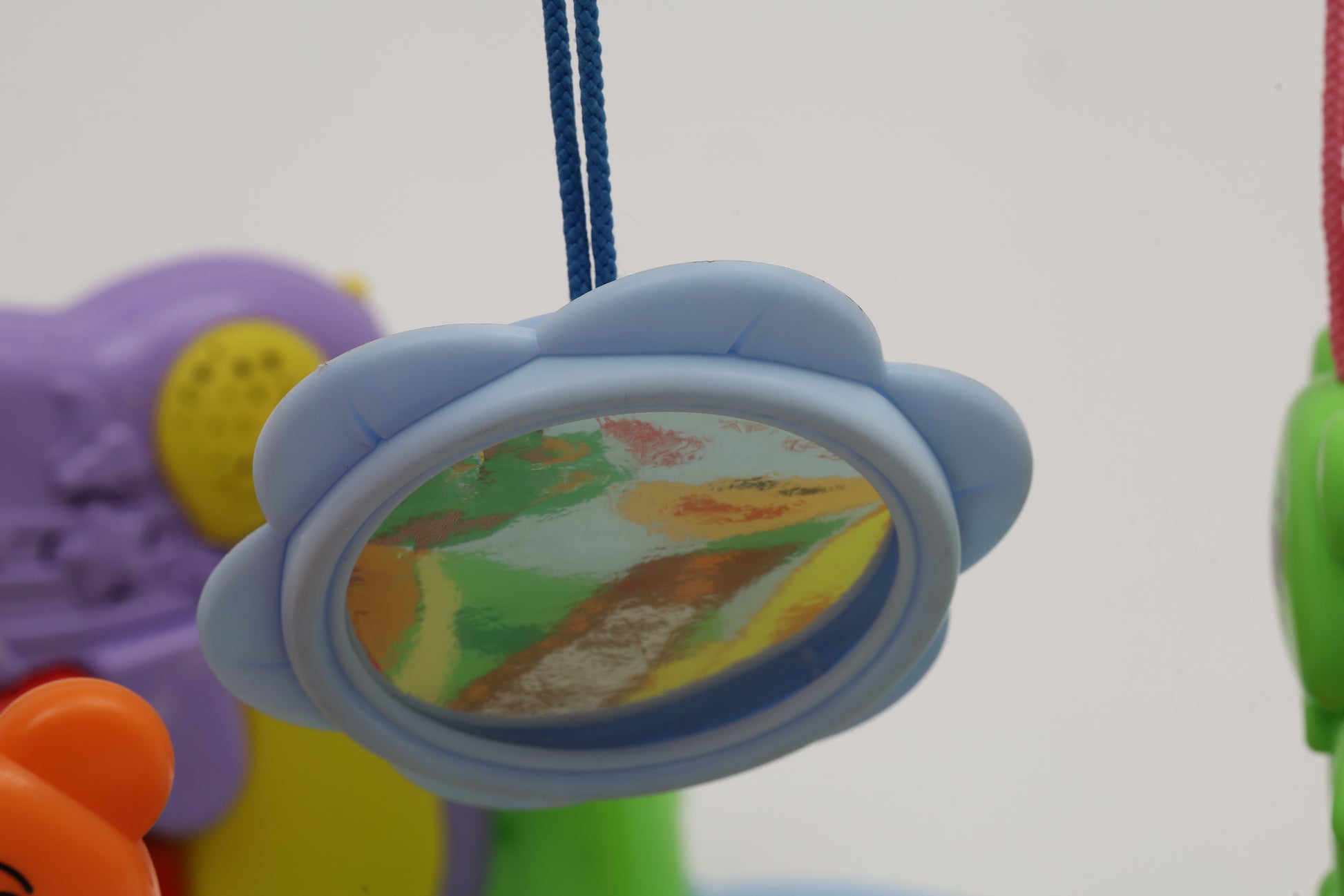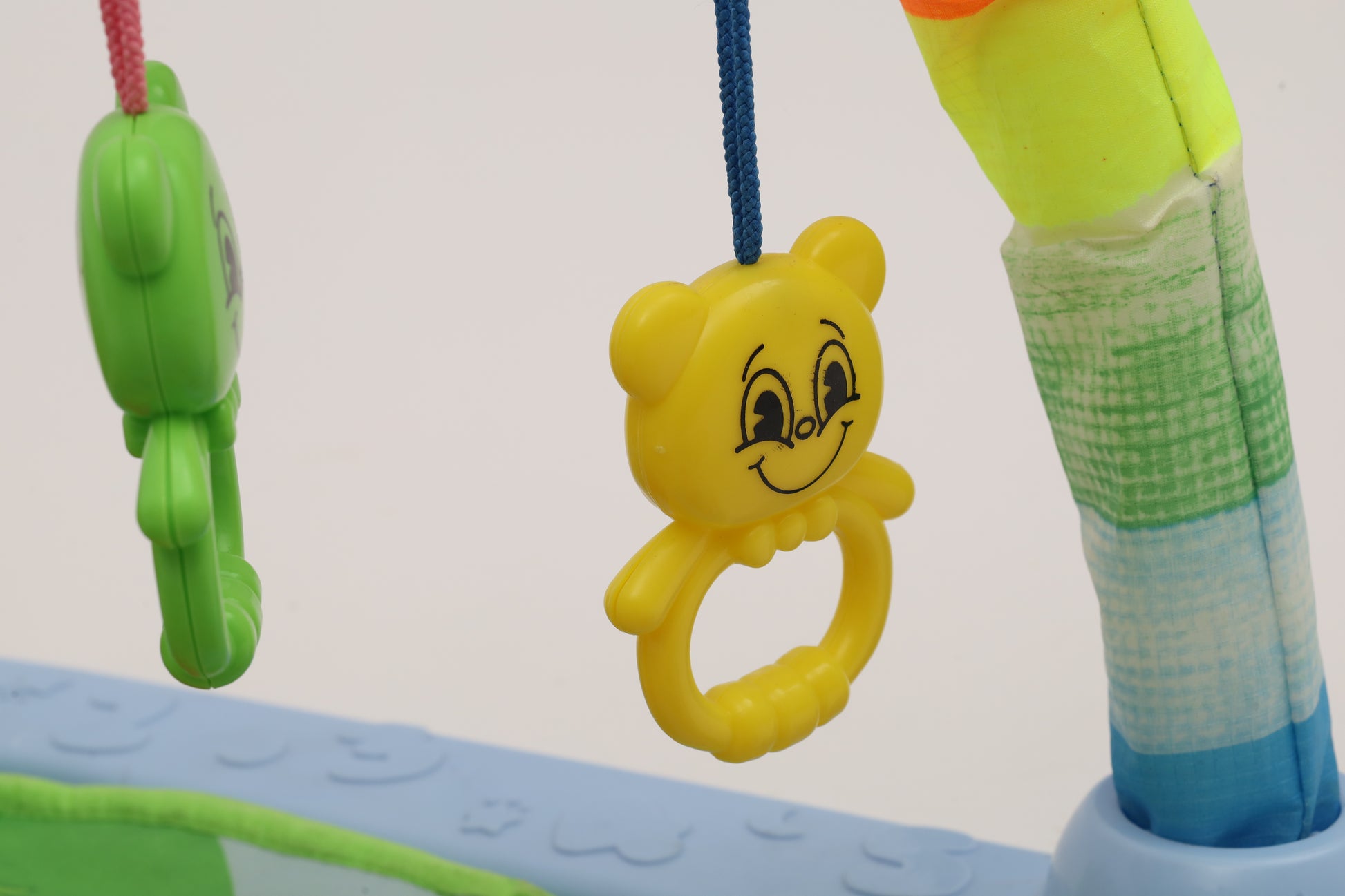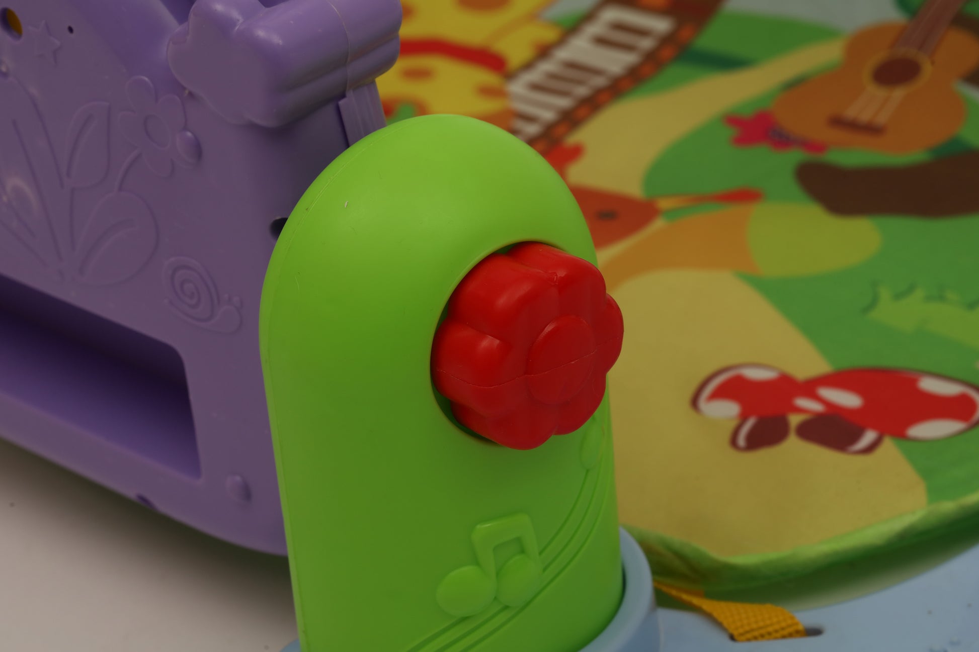 Safe, fun, colorful and interactive play mat that is perfect for baby's tummy time. This baby play gym features a soft, plush, padded and machine washable mat. There are four rattle toys and a mirror that baby can peek into. There is also a music keyboard that will play music as baby kicks. (charger not included)